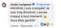Puis, elle renchérit en disant : « HAHAHA je suis crampée! Je suis trop émotive! J'aurais craqué à tout moment! 🙂 Vous êtes gentils! »