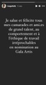 Magalie Lépine-Blondeau a écrit ceci en story : « Je salue et félicite tous mes camarades et ami.es de grand talent, au comportement et à l'éthique de travail irréprochables en nomination au Gala Artis. »